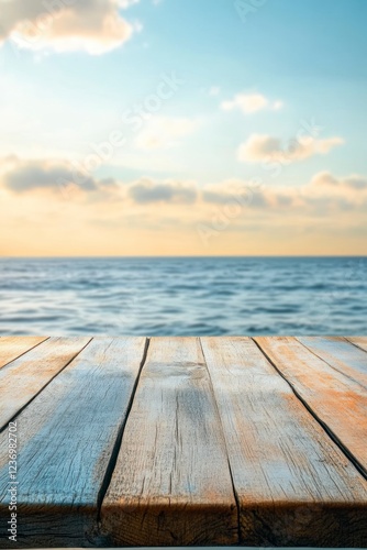 © El Media, Fototapeta premium Abstract blurred background with a wooden tabletop, featuring blue and orange colors, with the sky and sea visible in the blurry background.