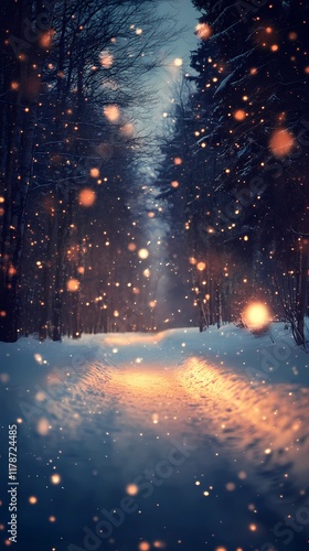 Naklejka premium Abstract blurred bokeh glow softly scattered along a frosty forest trail with snow-covered trees evoking a serene seasonal feel