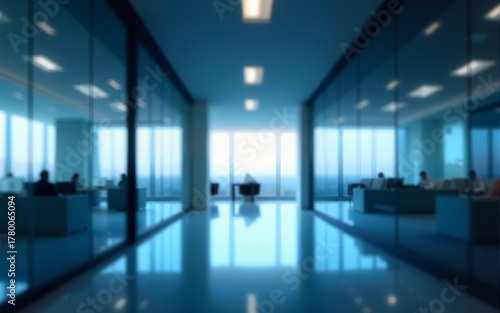 © Thomas, Fototapeta premium Abstract Blurred Interior of Modern Office Building with Glass Walls and Blue Light Effects. High quality