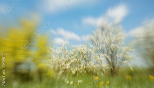 © raja, Fototapeta premium Abstract Blurred Springtime Landscape with Blooming Trees and Yellow Flowers