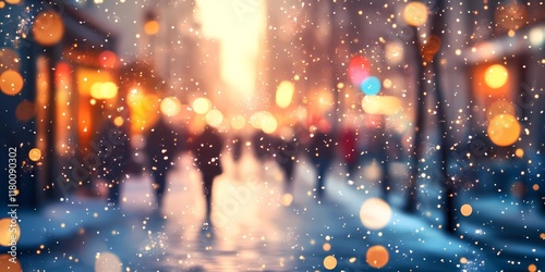 © Nikita, Naklejka premium Abstract blurred winter cityscape with softly glowing festive lights on snow-covered streets, creating a peaceful holiday atmosphere, style book illustration