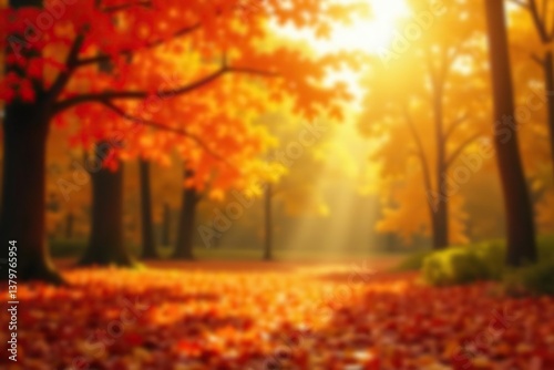 © wanlapa, Naklejka premium Abstract blurry background in warm yellow and red hues, with soft focus on autumn leaves in a sun-drenched forest setting, blurry, background