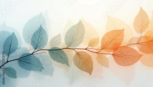 Fototapeta premium Abstract branch with transparent leaves in pastel blue, orange hues. Soft light creates gentle gradient effect. Delicate veins visible on foliage. This design suits backgrounds, decor, nature themes.