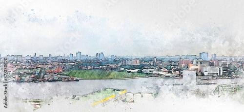 Obraz premium Abstract Building in capital on watercolor painting background and City on Digital illustration brush to art.