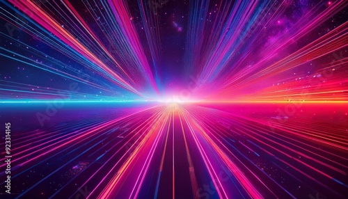 © M, Obraz premium Abstract burst of colorful light beams radiating from a central point in a cosmic space setting with vibrant gradient effects