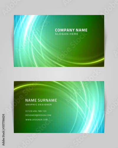 © Виктория Суханова, Naklejka premium Abstract business card with spiral swirls vector template. Green geometric lines futuristic gradient dance. Creative trendy textures in muted colors. Modern fantastic branding with opening tracery.