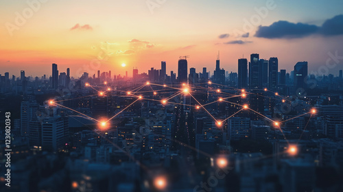 © Teeraphon, Fototapeta premium Abstract business man stands on Smart digital Innovation city with connection network reciprocity over the twilight cityscape. of future wireless digital city and social media networking systems