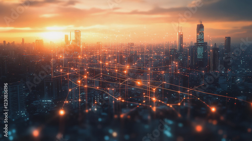 © Teeraphon, Fototapeta premium Abstract business man stands on Smart digital Innovation city with connection network reciprocity over the twilight cityscape. of future wireless digital city and social media networking systems
