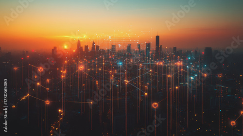 © Teeraphon, Fototapeta premium Abstract business man stands on Smart digital Innovation city with connection network reciprocity over the twilight cityscape. of future wireless digital city and social media networking systems