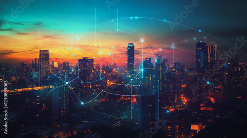 © Teeraphon, Fototapeta premium Abstract business man stands on Smart digital Innovation city with connection network reciprocity over the twilight cityscape. of future wireless digital city and social media networking systems