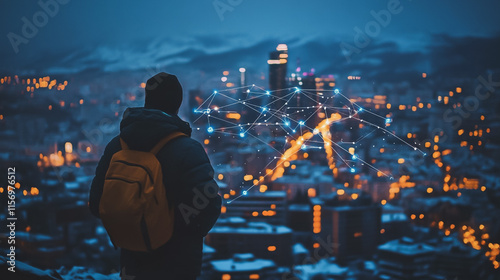 © Teeraphon, Fototapeta premium Abstract business man stands on the peak of success amid tall, innovative Smart city and graphs with statistics to analyze business potential and predict future developments in company growth.