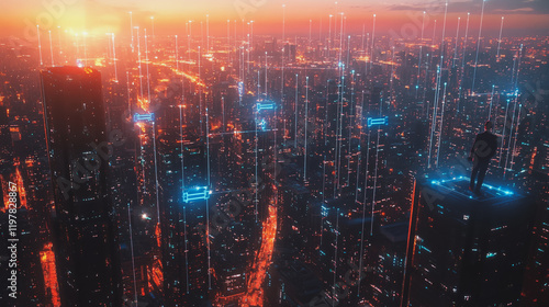 © Teeraphon, Fototapeta premium Abstract business man stands on the peak of success amid tall, innovative Smart city and graphs with statistics to analyze business potential and predict future developments in company growth.