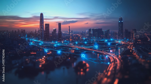 © Teeraphon, Fototapeta premium Abstract business man stands on the peak of success amid tall, innovative Smart city and graphs with statistics to analyze business potential and predict future developments in company growth.