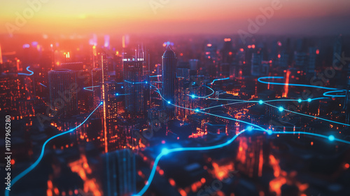 © Teeraphon, Fototapeta premium Abstract business man stands on the peak of success amid tall, innovative Smart city and graphs with statistics to analyze business potential and predict future developments in company growth.