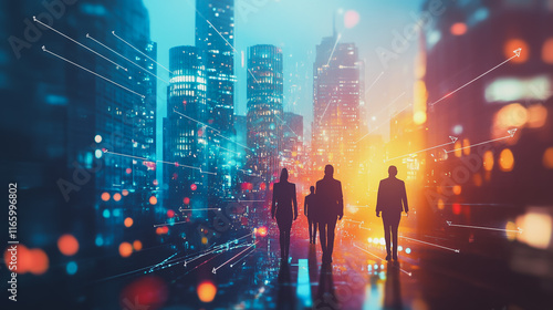 Obraz premium Abstract business team stands on the peak of success amid tall, innovative Smart city and graphs with statistics to analyze business potential and predict future developments in company growth.