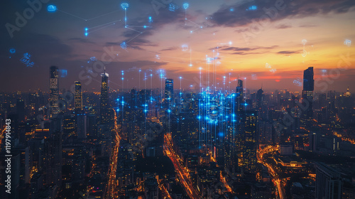 © Teeraphon, Fototapeta premium abstract, business, team, stands, peak, success, Abstract business man stands on the peak of success amid tall, innovative Smart city and graphs with statistics to analyze business potential and predi