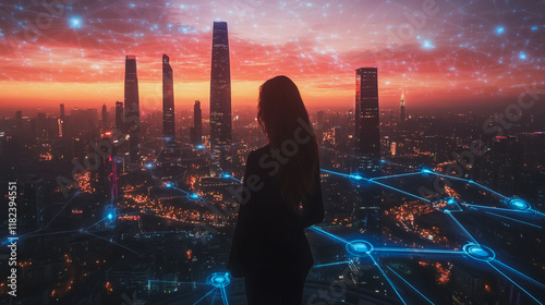 © Teeraphon, Fototapeta premium Abstract business woman stands on the peak of success amid tall, innovative Smart city and graphs with statistics to analyze business potential and predict future developments in company growth.