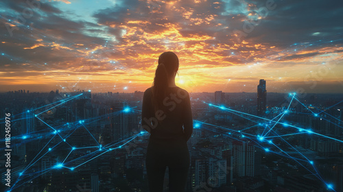 © Teeraphon, Fototapeta premium Abstract business woman stands on the peak of success amid tall, innovative Smart city and graphs with statistics to analyze business potential and predict future developments in company growth.