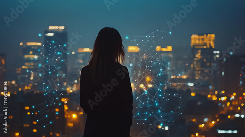© Teeraphon, Fototapeta premium Abstract businesswoman stands on the peak of success Smart digital city with connection cyber security network reciprocity over the cityscape future wireless digital city and social media networking
