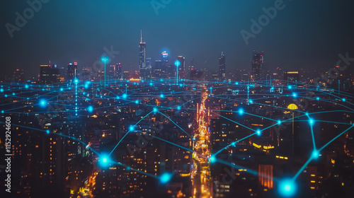 © Teeraphon, Obraz premium Abstract businesswoman stands on the peak of success Smart digital city with connection cyber security network reciprocity over the cityscape future wireless digital city and social media networking