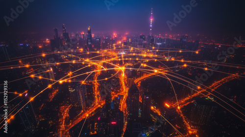 © Teeraphon, Naklejka premium Abstract businesswoman stands on the peak of success Smart digital city with connection cyber security network reciprocity over the cityscape future wireless digital city and social media networking