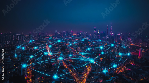 © Teeraphon, Naklejka premium Abstract businesswoman stands on the peak of success Smart digital city with connection cyber security network reciprocity over the cityscape future wireless digital city and social media networking