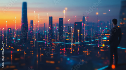 Fototapeta premium Abstract businesswoman stands on the peak of success Smart digital city with...