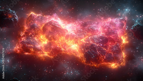 Fototapeta premium Abstract celestial formation fiery rocks illuminated in a dark space amidst stars and nebulous clouds