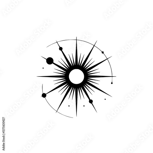 © MatandSterre, Obraz premium Abstract Celestial Illustration: Sunburst with Planets in Minimalist Style