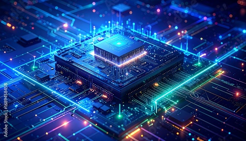 © fidal, Obraz premium Abstract circuit board with glowing central processor
