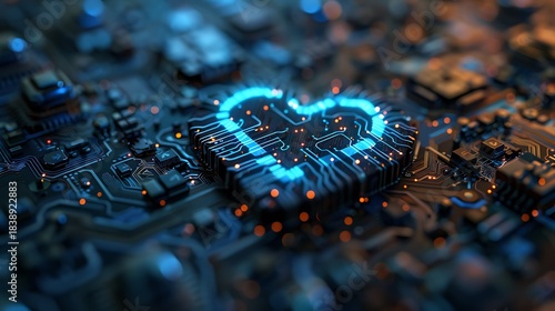 Fototapeta premium Abstract circuit-chip heart symbol glowing in soft blue tones futuristic...