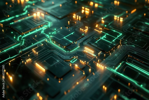© artbot, Obraz premium Abstract circuitry with glowing elements in dark space