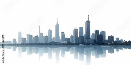 © RAZ, Fototapeta premium Abstract city featuring a factory and skyline with tall buildings, factory Cityscape in High Contrast 3D Style. winter evening, sunset, snow gently falling, rainy morning text space background .