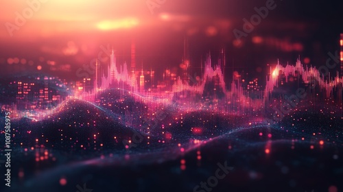 Fototapeta premium Abstract city landscape with glowing data waves.