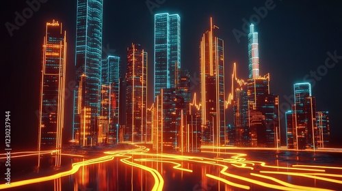 © Muhammad, Obraz premium Abstract city lights form neon pathways around glowing skyscrapers at night.