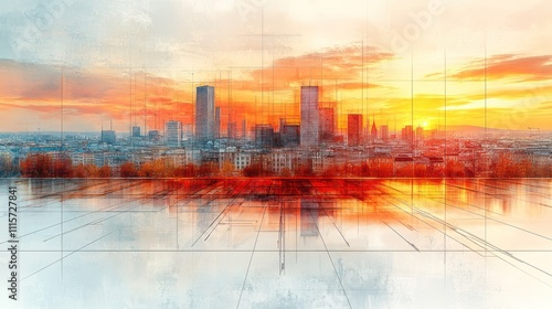 © wulan, Obraz premium Abstract city skyline at sunset with vibrant colors and reflections.