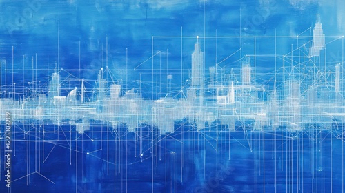 © lestari, Obraz premium Abstract city skyline, digital network, data flow, blue background, tech concept