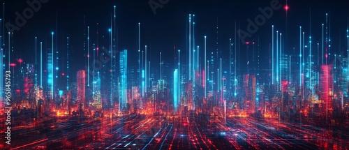 Obraz premium Abstract City Skyline with Digital Equalizer in Blue and Red