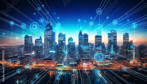 © StockTopia, Fototapeta premium Abstract City Skyline with Skyscrapers Overlaid by Blockchain Data Chains and Glowing Icons