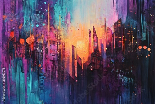 © Chand Abdurrafy, Obraz premium Abstract Cityscape at Sunset Vibrant Colors and Texture