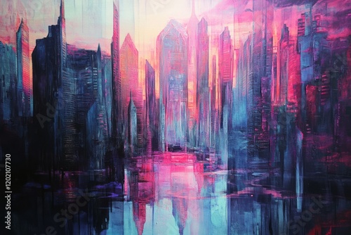© Chand Abdurrafy, Obraz premium Abstract Cityscape Painting Showing Vibrant Hues at Sunset