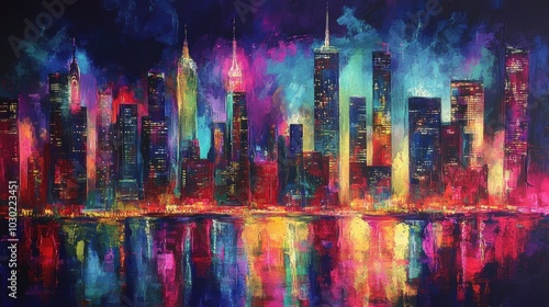© Ali, Obraz premium Abstract cityscape painting with vibrant colors.