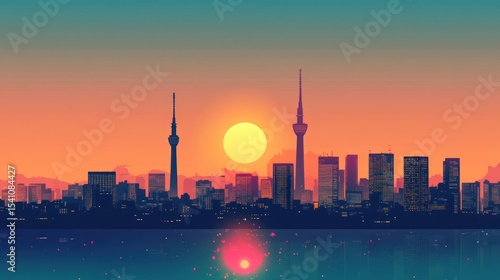 © Berkah, Fototapeta premium Abstract cityscape silhouette at sunset reflected over serene water surface