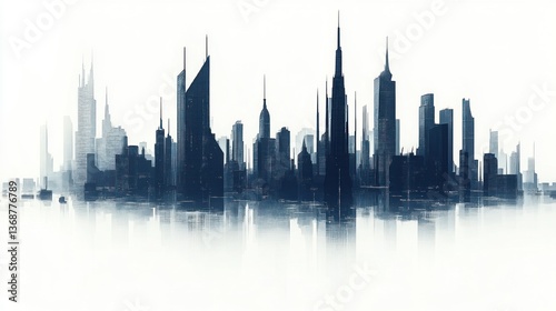 © Anisah, Naklejka premium Abstract cityscape silhouette with modern architecture against bright sky backdrop