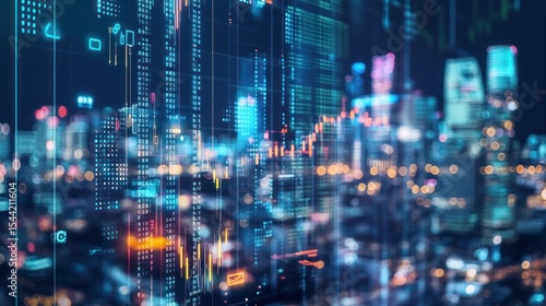 © kiki__, Obraz premium Abstract Cityscape with Financial Data Overlay, Modern Finance Visualization