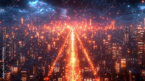 © atik, Obraz premium Abstract cityscape with glowing lights and futuristic design in blue and orange tones.