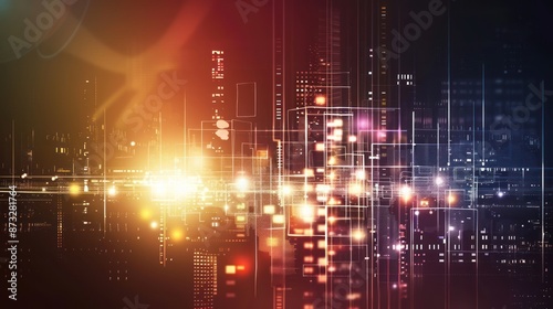 Obraz premium Abstract cityscape with glowing orange and yellow lights and grid lines on a...