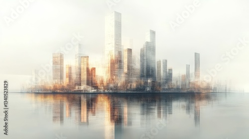 Fototapeta premium Abstract cityscape with reflections on a calm body of water