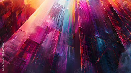 © Agung, Fototapeta premium Abstract Cityscape with Towering Shapes and Vibrant Lights on Dark Background