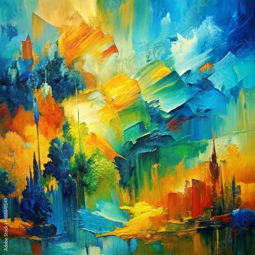 © BrilliantPixels, Obraz premium Abstract Cityscape with Vibrant Hues - Oil on Canvas, City, Architecture, Urban Landscape, Color